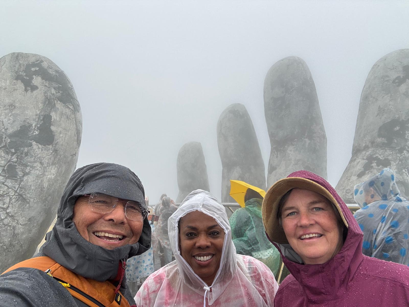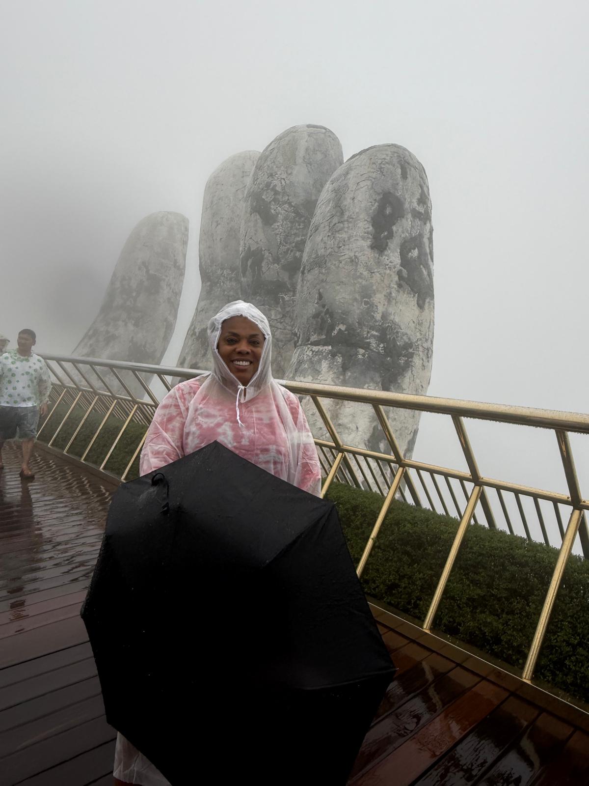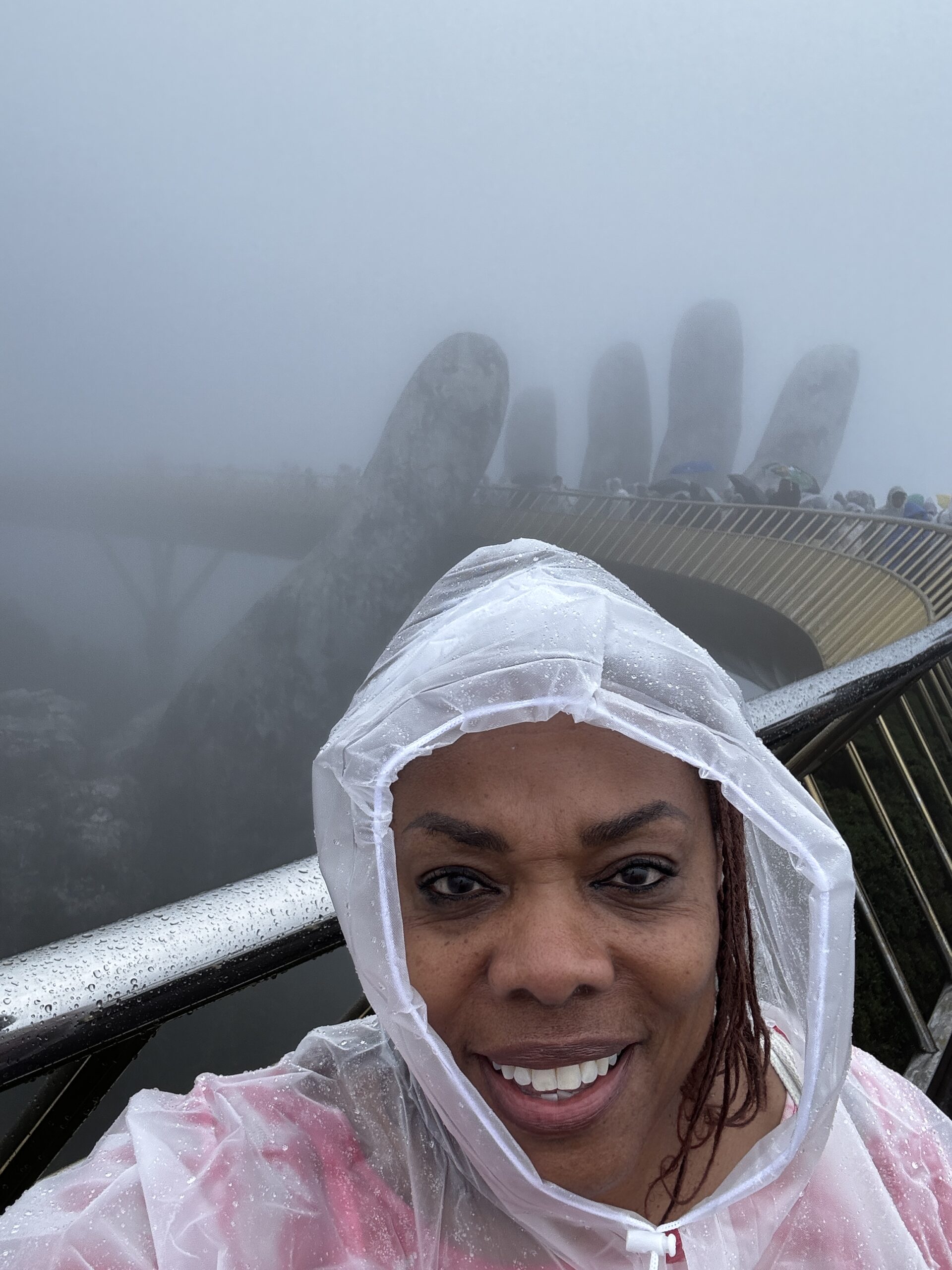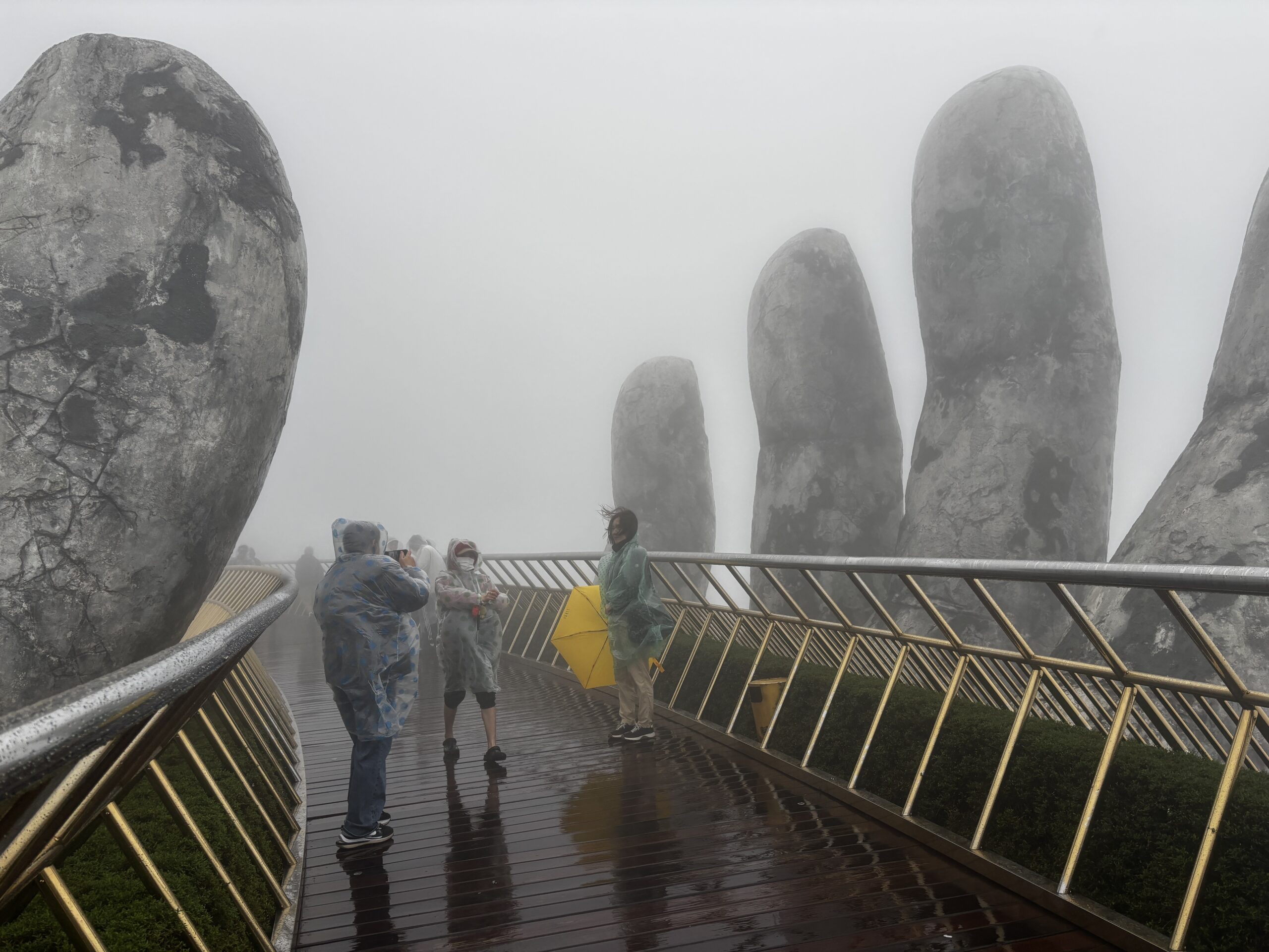 I had one of the best sightseeing adventures at the Golden Hand Bridge (1,414 meters above sea level). To get to the bridge you first need to ride a cable car for about 20 minutes. The cable car isn’t moving slow; it’s just a long distance from the bottom to the top. Even then you haven’t reached the bridge. You have to ride a funicular for a short distance and finally you’re there. By the time we reached the area, it begins to rain. I bought a plastic raincoat and kept it going. Seeing the bridge in person was AMAZING!!! I was glad that we were able to see the bridge cause a lot of the town up there was not very visible. There’s a lot to see and do up there but because of the rain and fog, we (me and the Colorado couple) decided to get some good pictures and head back to the city.