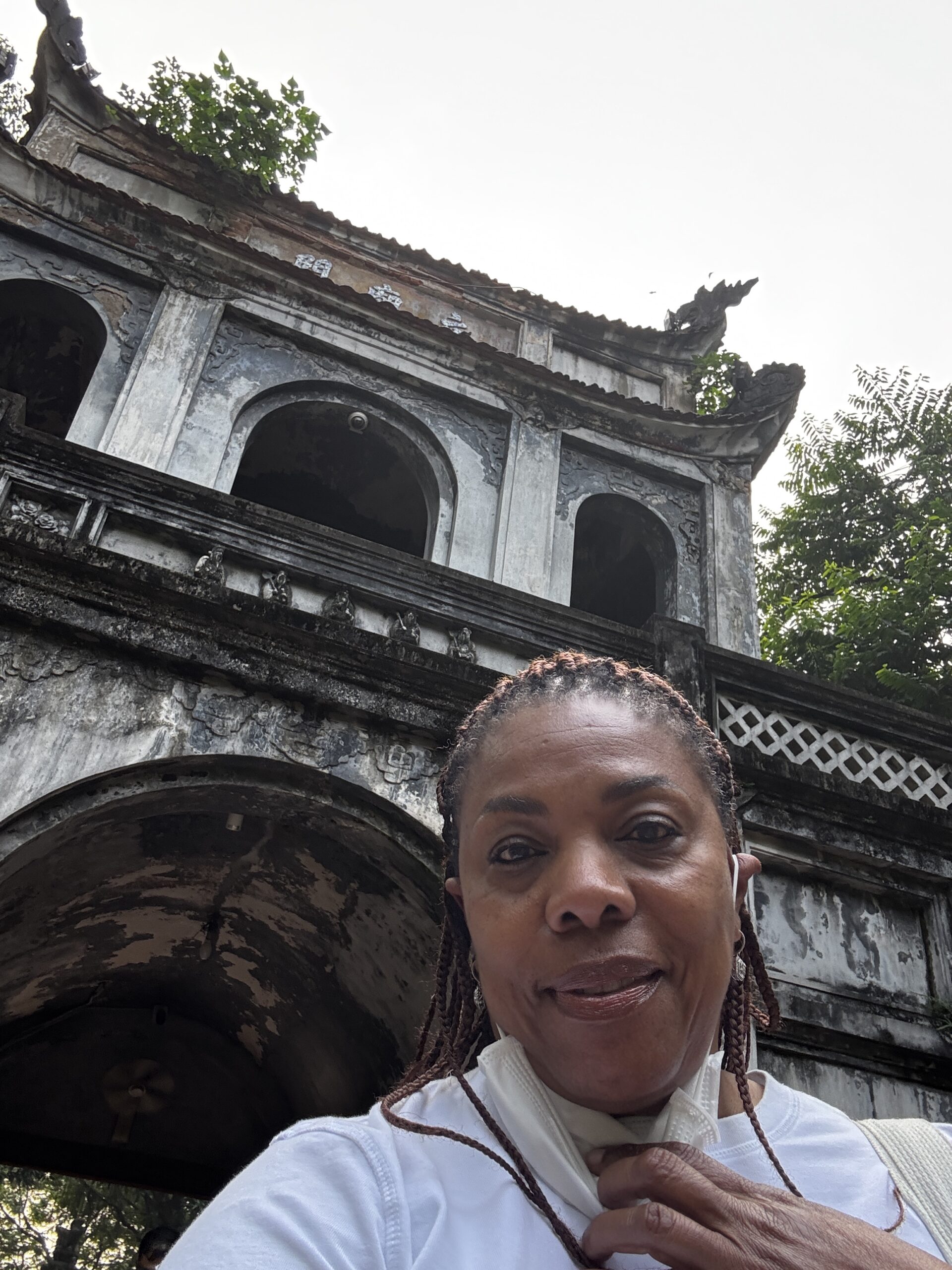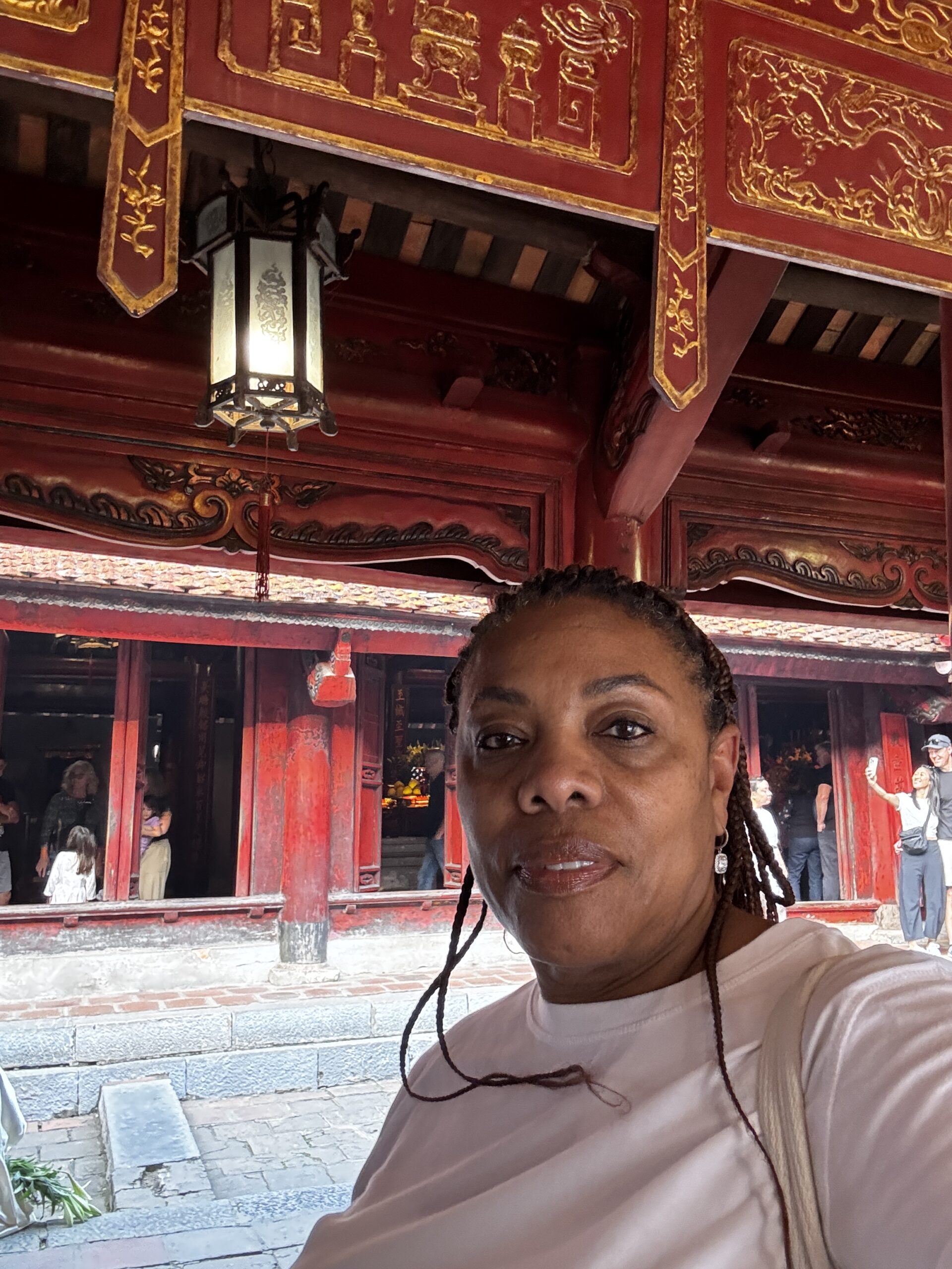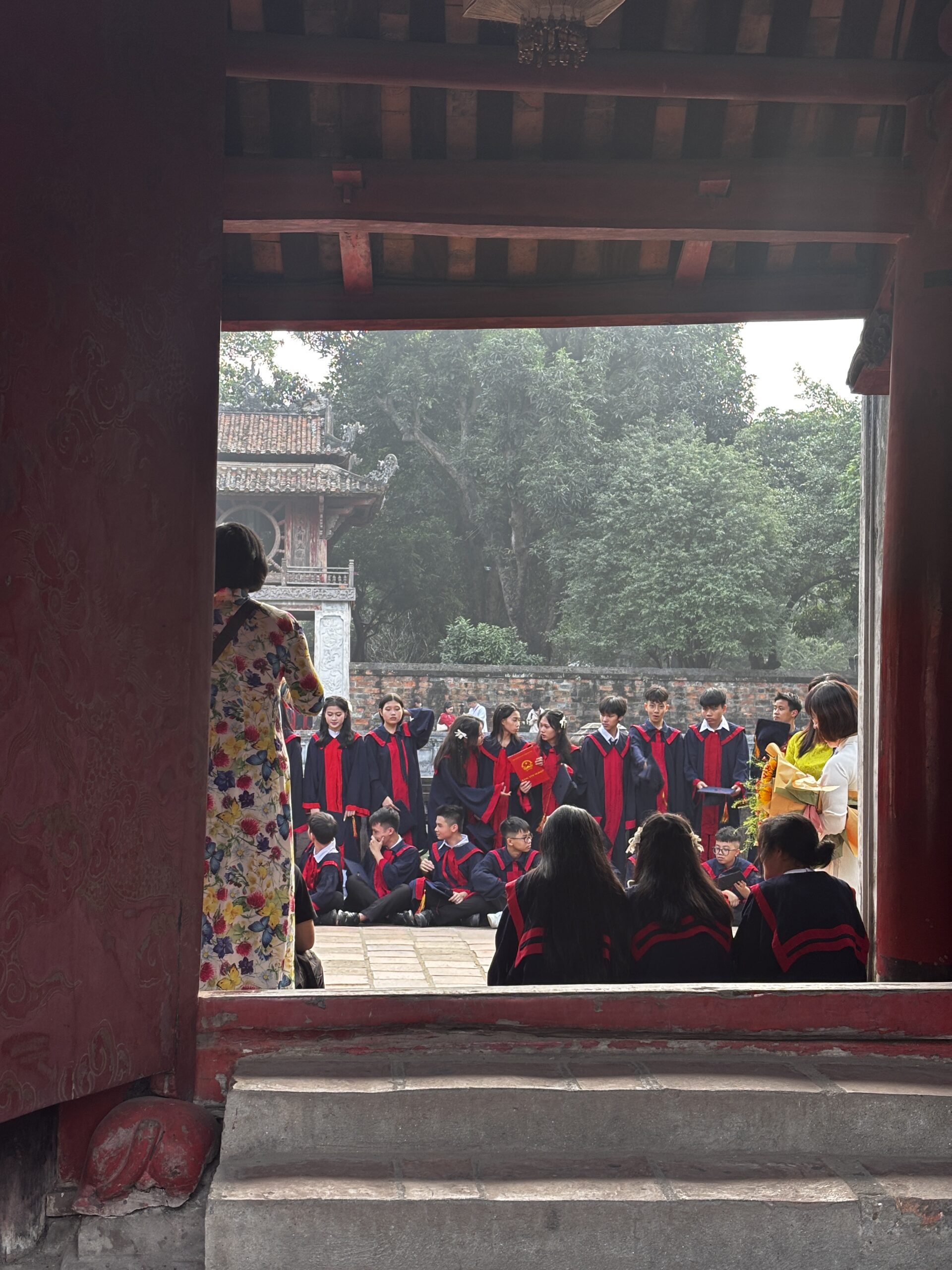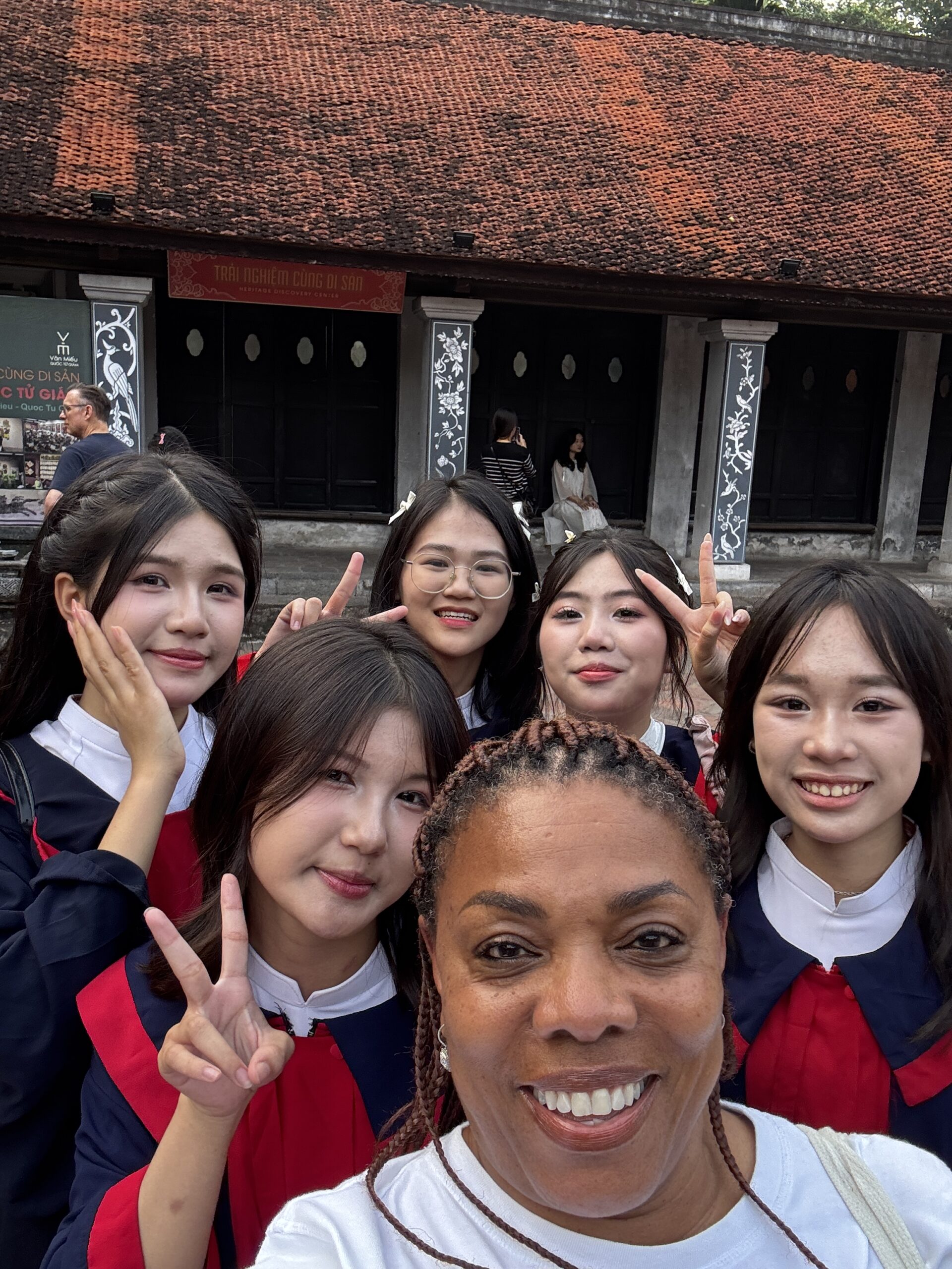 I got a chance to ride the hop on/off sightseeing bus and saw a couple of areas that I later visited on my own. One return visit was to the Temple of Literature. When I arrived I saw a large group of school kids dressed in what looked like graduation caps and gowns. Navigating my way through the crowd of students, I was able to see inside and around the temples. The students began to sing so I stopped to watch. As I turned to leave, there were 2 young girls asking if they could take a picture with me. I’ve heard of this from people who have visited China, but these girls nicely asked, whereas the folks in China will sneak a picture or stand near you and snap.