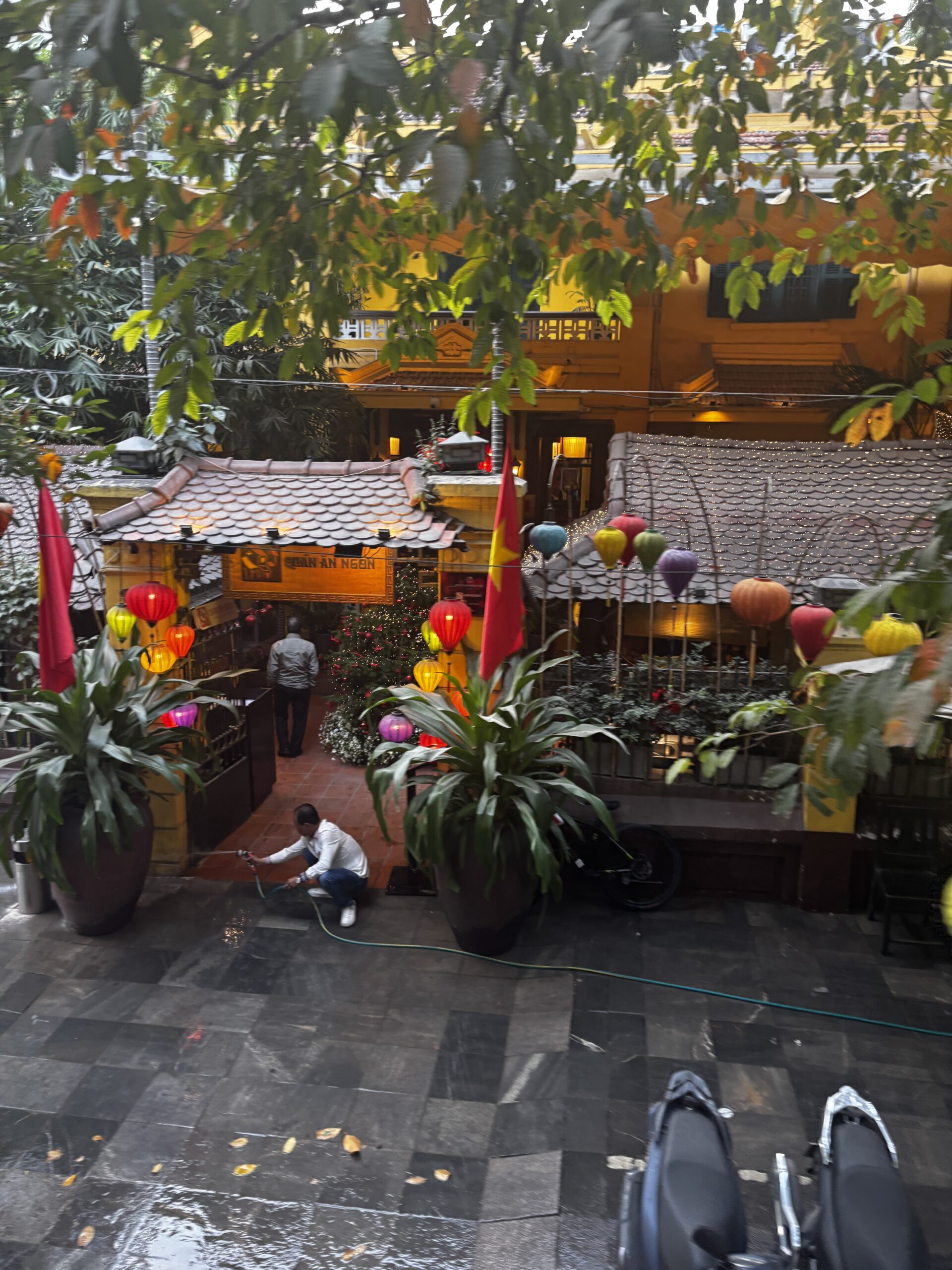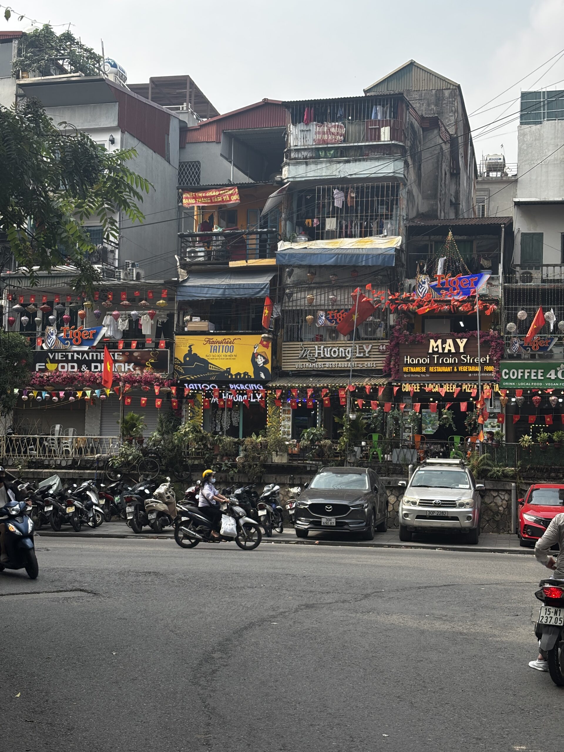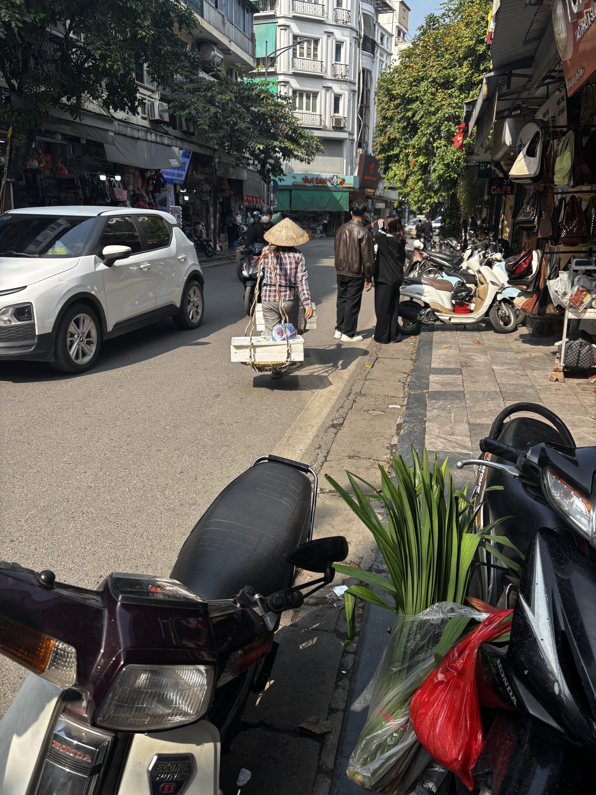The traffic in Ha Noi is so chaotic. There doesn’t seem to be any reasoning on which way traffic is flowing or who has the right of way. Everyone just seems to be in the intersection and blowing their horns while moving along. It’s even worse when you try to cross the street. On one of my tours we walked through the Old Quarters. We were told to walk with confidence, don’t make eye contact with the drivers, and not to move backwards cause there will already be a motorbike or car moving in that space. I was glued to the guide every time we crossed the street. Walking has other hazards like having to walk in the streets because the sidewalks are filled with motorbikes, or stores and restaurants have taken over the spot of sidewalk.